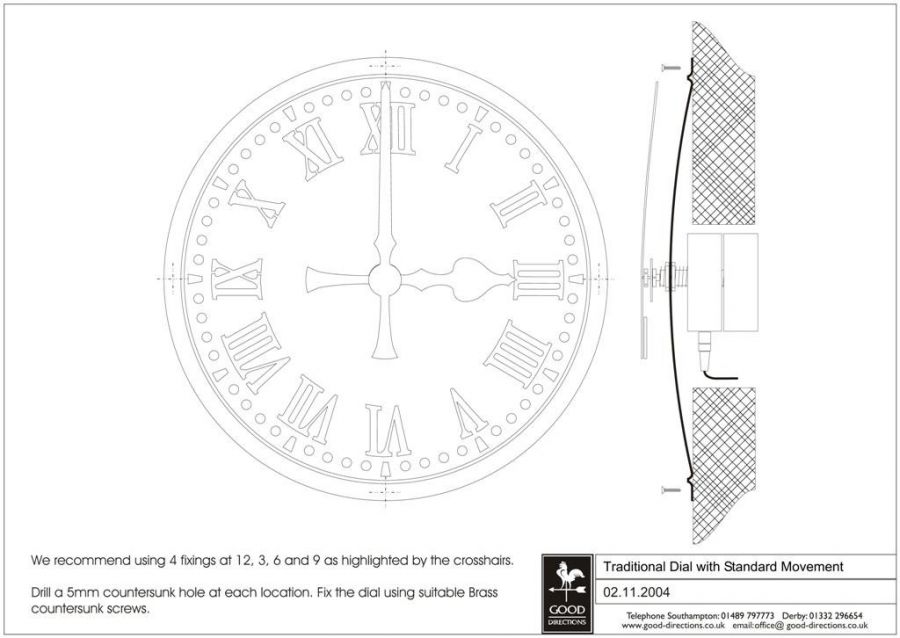 Drill a 5mm countersunk hole at each location. Fix the dial using suitable brass countersunk screws.