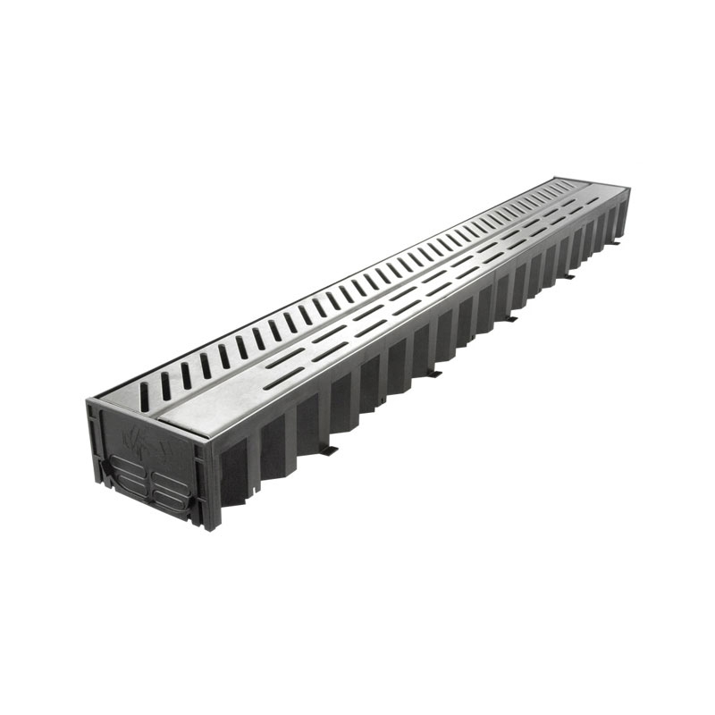 Manufactured from recycled polypropylene, the 1m channel unit is combined with two Heelguard, friction-fit stainless steel gratings. In addition to the channel unit, all accessories such as end caps and outlet connectors are provided within the pack to achieve a simple, professional installation.image