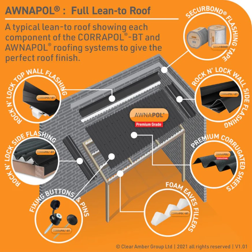 Thanks to having the same corrugated profile as Corrapol®-BT sheets, Awnapol® is fully compatible with Clear Amber's range of Corrapol® accessories, such as their Super Ridge and the Rock N' Lock Flashing.
