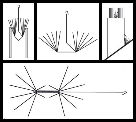 Method 3: In the V-Shaped area behind the chimneystack where the stack meets a pitched roof.This method is used when the seagulls are nesting in the v-shaped groove behind chimney where it meets the pitched roof. Use one scarborough spike system for every 300mm of width of the chimneystack. Open the system into a double-fan shape such that the spikes point up the slope of the roof. Secure the longest rod to the back of the chimney stack brickwork top and bottom using the screws and clips provided, to firmly anchor it in position. Do not leave any gapo greater than 100mm either beside or in between multiple spike systems.