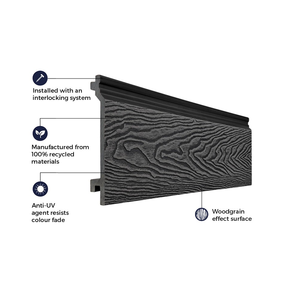 Cladco Composite Cladding can be fitted horizontally or vertically. When installing Cladco Composite Cladding, it is recommended that you use battens made from composite material to maximise the long term performance of your cladding. Attach a Cladco Wall Cladding Starter Strip to the bottom of each joist before slotting the first cladding board into place. Create a high end finish for your cladding project by using Cladco Corner Trims and Cladco Skirting Trims.