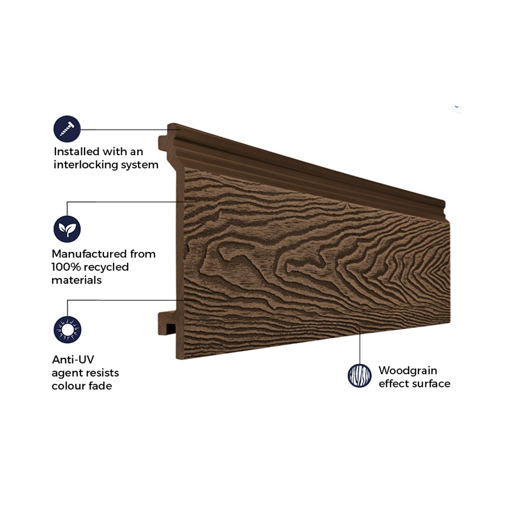Cladco Woodgrain Composite Cladding boards are a long lasting, easy to maintain alternative to timber cladding made from a combination of recycled wood and plastic. The cladding gives a contemporary look and will add protection to a building project.