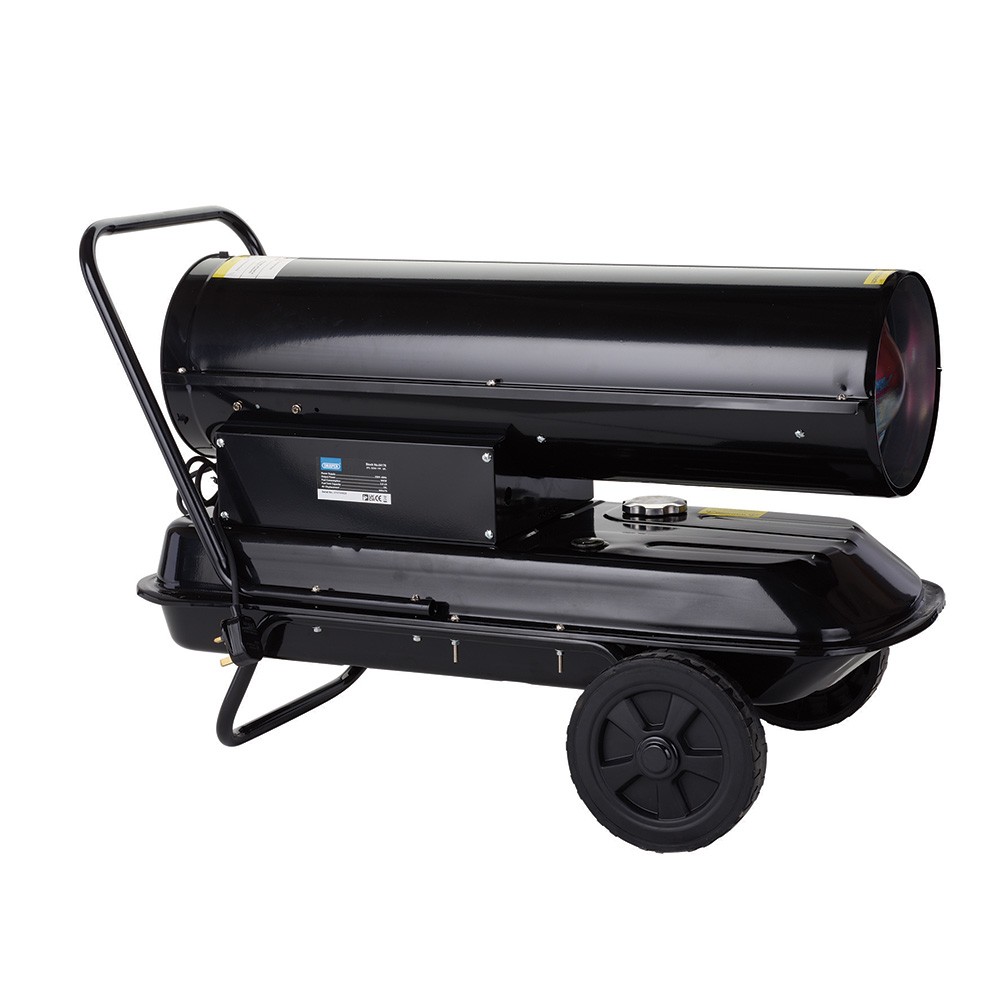 This multi-fuel diesel and kerosene clean burn heater is fitted with a compressor pump for high efficiency. The 33L tank offers great fuel economy, able to heat large spaces quickly and evenly for approximately 10 hours. It is manufactured from high-quality steel and has a protective gloss black powder-coated finish. There is a simple on/off switch for ease of use and a LED light shows when in operation. It is fitted on a steel frame with wheels for maneuverability. This heater is only suitable for use in open and semi-open environments such as workshops, garages, factories and jobsites. Grade 2 or higher kerosene required.