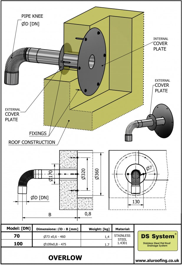 DS System's 70mm and 100mm Overflow G is manufactured from high quality stainless steel to prevent a build-up of water that will cause a roof to flood. This is typically down to debris clogging a roof drain but it’s prudent to prepare for these cases as a flooded flat roof can cause untold damage to pipes and services as well as promoting leaks and structural damage.