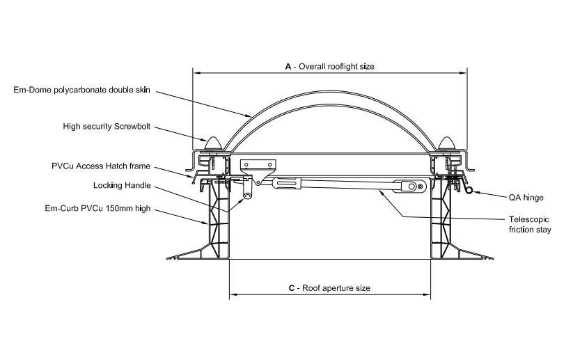 Em Access Hatch Polycarbonate Dome with 150mm PVC Curb 600 x 600mm