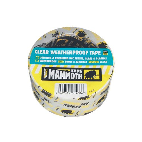Everbuild mammoth clear weatherproof tape is a strong weatherproof tape with aggressive adhesive, ideal for jointing and repairing of all PVC and polythene sheets and many other uses in construction, industry and the home. Ideal for repairing cracks in glass and acrylic without obscuring vision or light. Easy tear serrated edges to enable quicker application.