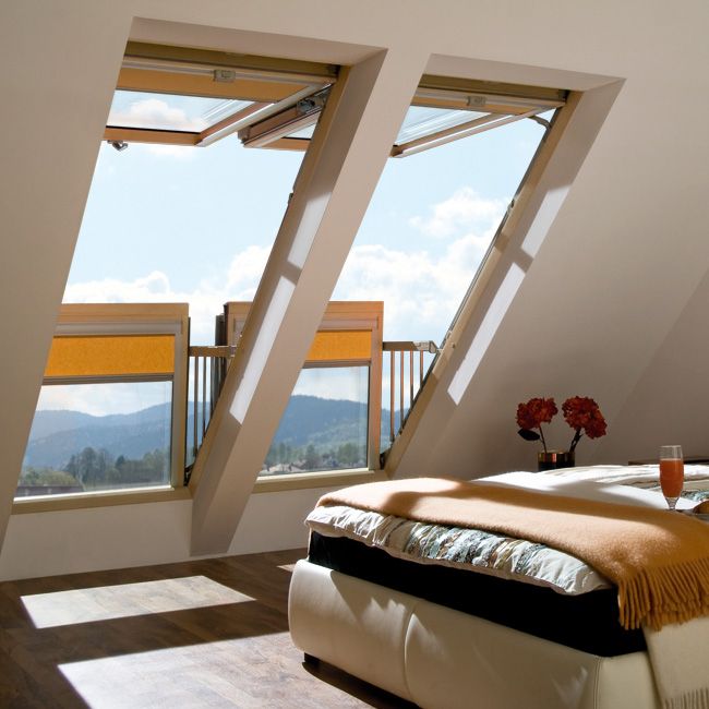 •  Innovative, large roof window in which the open sashes create a balcony. The upper sash is opened upwards, the lower forward allowing easy access to the balcony bay.