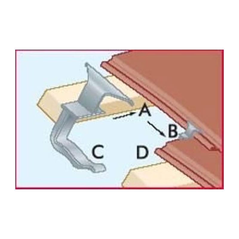 Available in a pack of 100 to complete your projects, these Gemini® Plain Tile Clips from Forticrete are tile-to-tile clips made with sturdy plastic structures. Regarding the image provided, you can attach the tile clips to the tile interlock at point A and then slide them downwards to point B. The curved underlock (C) is positioned beneath the back of the tile below (D).