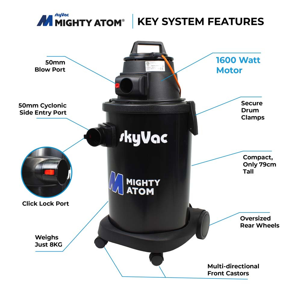 Being smallest SkyVac in the family means that it does not require much space in your van. The ATOM can tackle any challenge you want to throw at it in all sorts of environments including domestic and commercial properties with the added feature of a blow function means the multi-talented ATOM can carry out the following tasks: