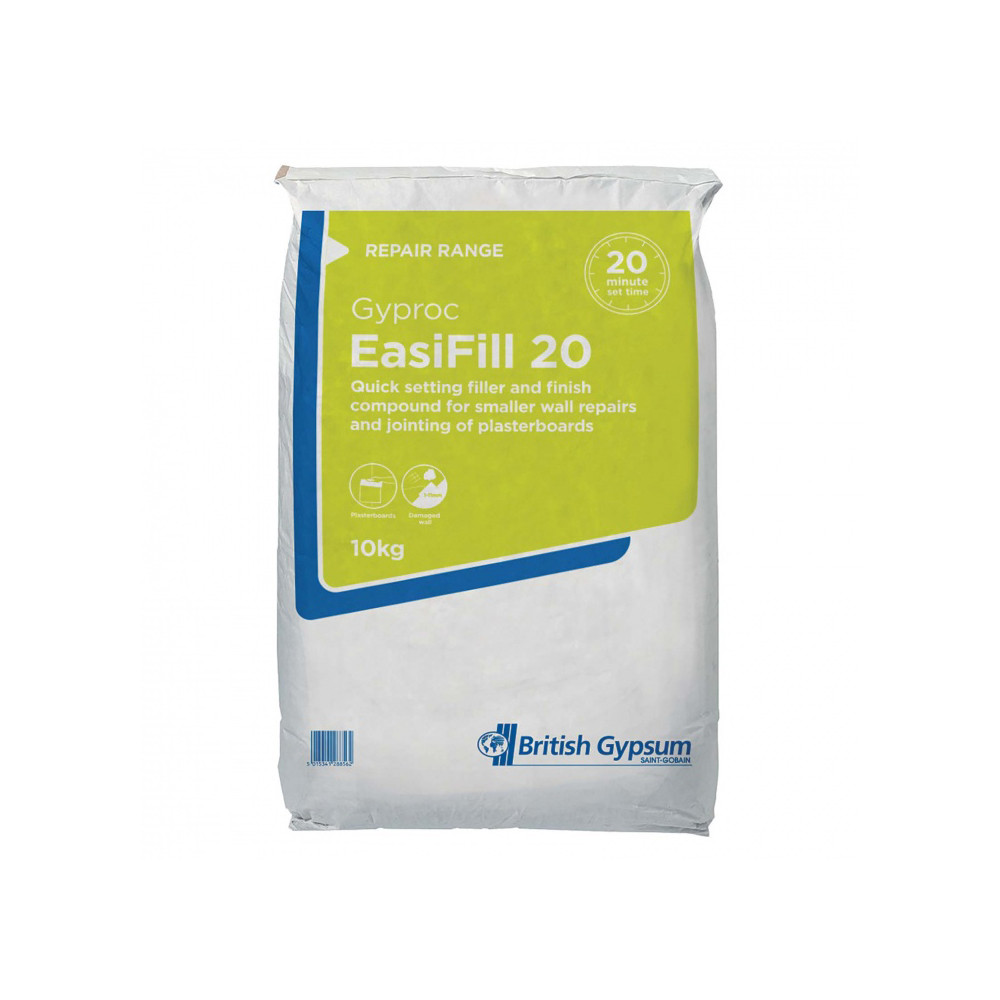 This Gyproc EasiFill 20 is a powder filler produced for quick general-purpose filling, snagging or cove adhesive. It has a twenty-minute working time making it ideal for patching, repairs and small jobs.