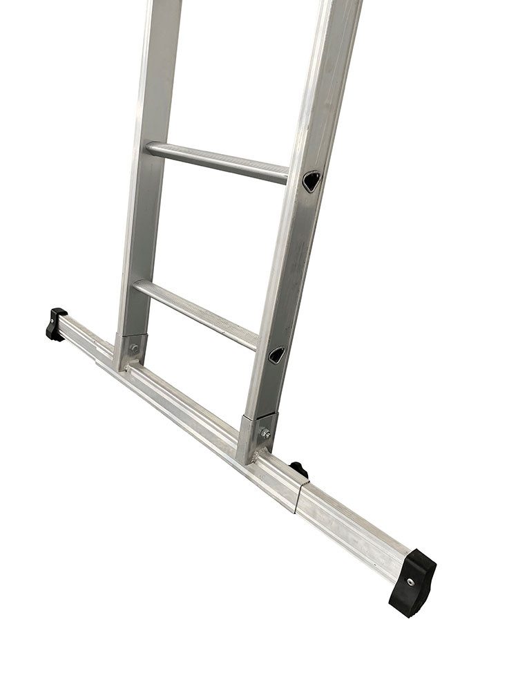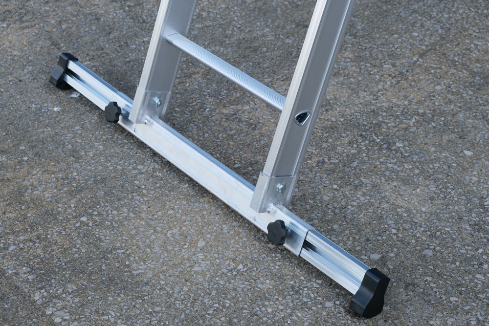 Thanks to its light, aluminium structure and retractable stabiliser bar, this D MAX Three-Section Extension Ladder can be easily carried and transported. It is a lightweight and robust D-rung ladder with a deployable stabiliser bar.