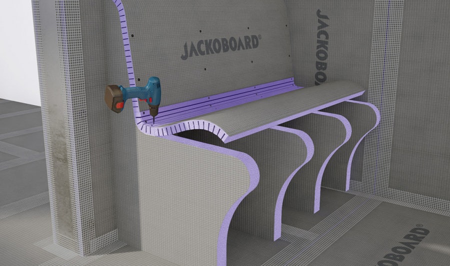 With its pattern of slits on one side, JACKOBOARD Flexo creative construction board is extremely easy to bend, making it ideal for creating curved shapes. Slots are available length ways or cross ways. Its extruded polystyrene (XPS) foam core makes it water-repellent, and the special coating on both sides permits the direct application of tiles, render or plaster. That means JACKOBOARD Flexo is the perfect construction board for forming curved contours in rooms with high humidity – and due to its excellent thermal properties, it can also be used as a flexible thermal insulation board.