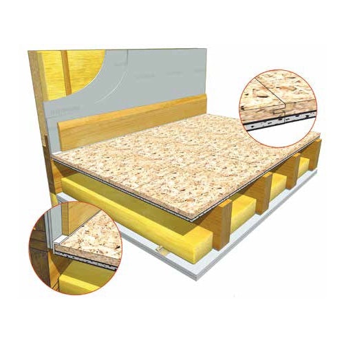Composition: 22mm T&G P5 chipboard with a pre-bonded 15mm resilient acoustic layer.