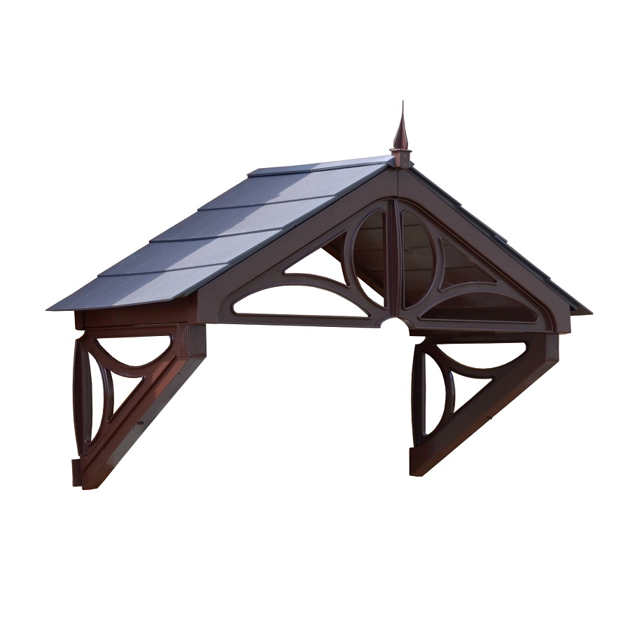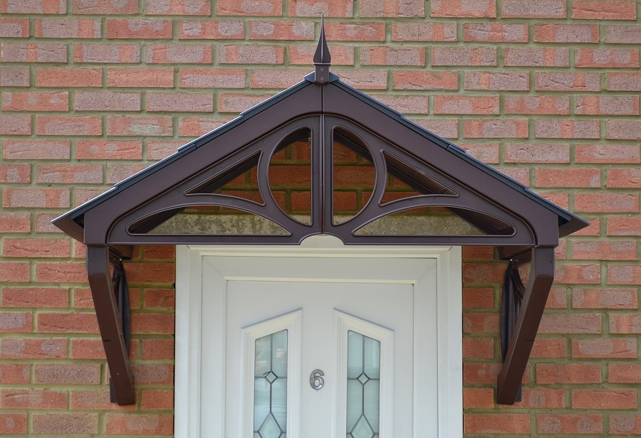 The Hilton Apex door canopy features front and side panels with the Kovertek distinctive design mouldings. The front panel is full height from the top of the gables to the apex. The side panels are open in design featuring scroll effect mouldings.
