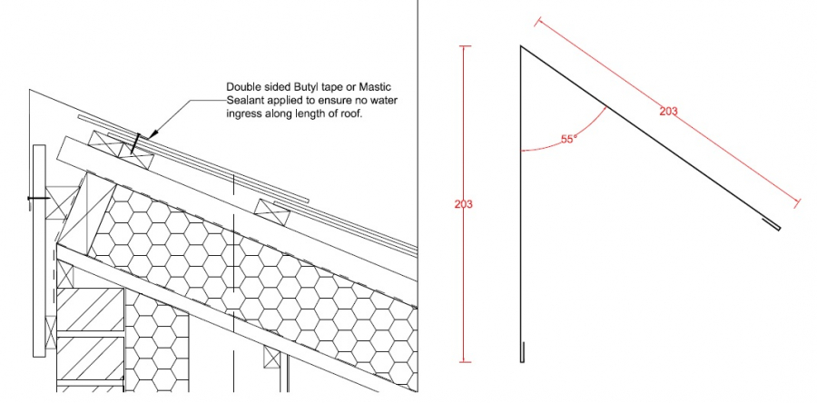 Kytun Monoridge 55dg 203mm x 2.4mDimensionsAngle: 55 degreeWings: 203mmLength: 2.4mDouble sided Butyl tape or Mastic Sealant applied to ensure no water ingress along length of roof. Read More