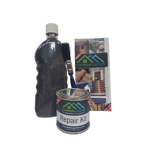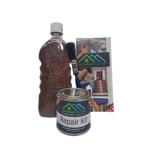 Available in various colours to match your roof tiles, this Lightweight Roof Tile Repair Kit is generally used when exposed screw heads require covering after installation. This kit provides a tin of varnish, a bottle of granules in the colour you've selected and a brush that can be used for application.