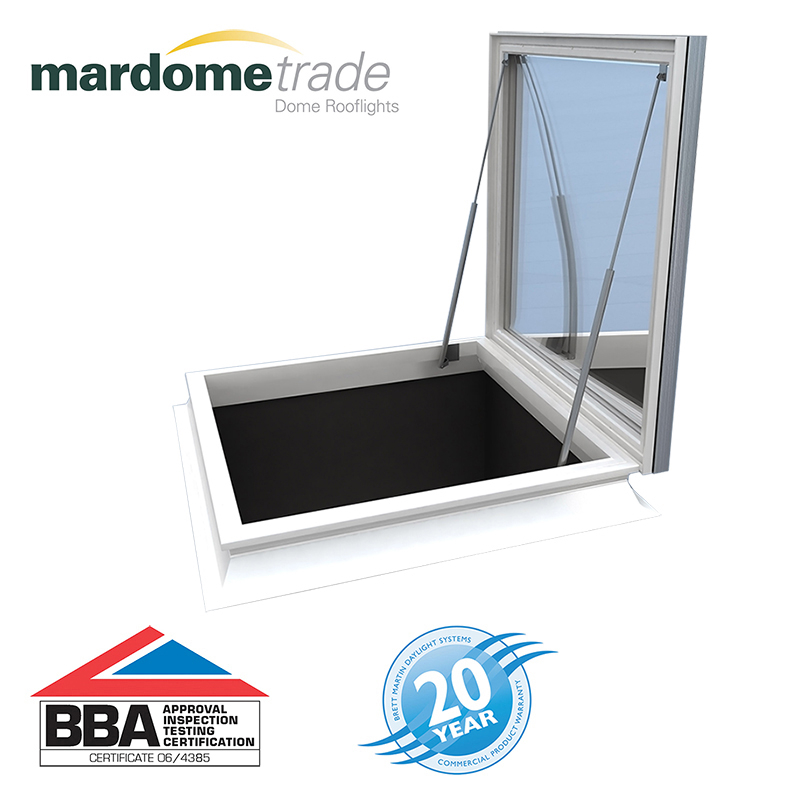 Mardome Trade double glazed access hatches comprise of a kerb, dome and insulated PVC upstand. The rooflight opens to between 70° and 83° to allow for access to roofs for both maintenance and as an emergency exit. Two gas struts hold the rooflight open and keep it securely in place.