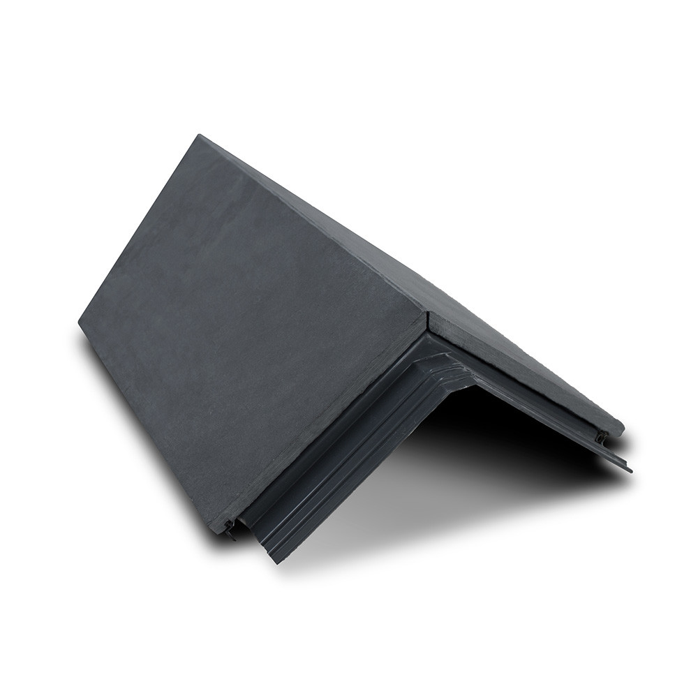 This hip end tile is designed to be used at the end of a hip run and constructed from real 12mm thick Graphite coloured natural grey slate. It has been chemically and mechanically bonded to a weatherproof, long-life glass-reinforced polyester (GRP) liner. The wings of the tile have been widened to 200mm to ensure maximum coverage.
