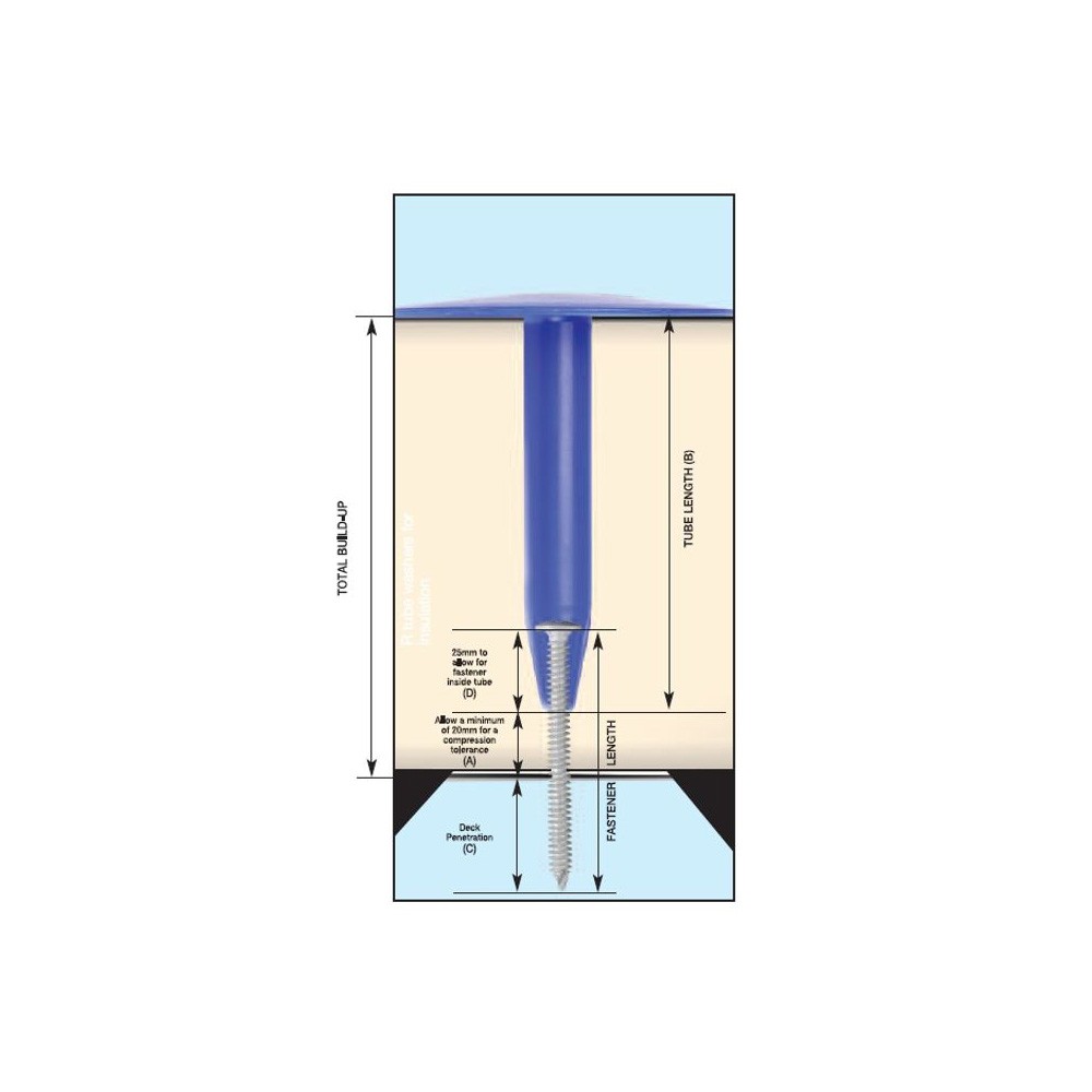 To decide on the maximum tube length (B), subtract 20mm from the total build-up of the roof system to allow for (A) compression of the insulation. Pick the tube with that length or shorter. For example, with a requirement for an R-75 tube washer and an 85mm build-up, the maximum tube length would be 656mm, so the 60mm long R-75 x 60 would be chosen.