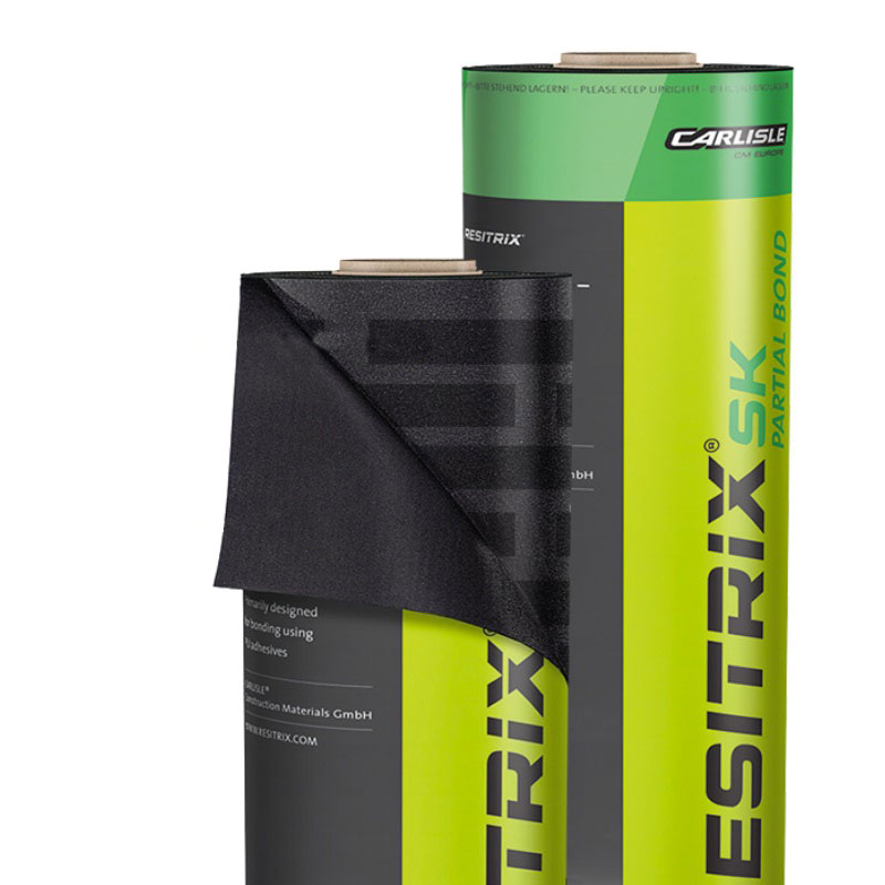 RESITRIX SK Partial Bond is a glass reinforced, composite rubber membrane with an EPDM core and the underside is partially coated with self-adhesive polymer modified bitumen, with a release film.The removable release film is important for the partially self-adhesive RESITRIX SK Partial Bond, preventing the membranes from adhering to the substrate before the roofer is ready.