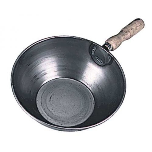 This is a small tar bowl designed with a wooden handle. The wooden handle provides a comfortable and sturdy handle that will not absorb any heat that comes from the hot tar. The tar bowl is used when applying tar to roofs and other surfaces, especially when working on small areas that require the tar to be applied quickly and accurately.