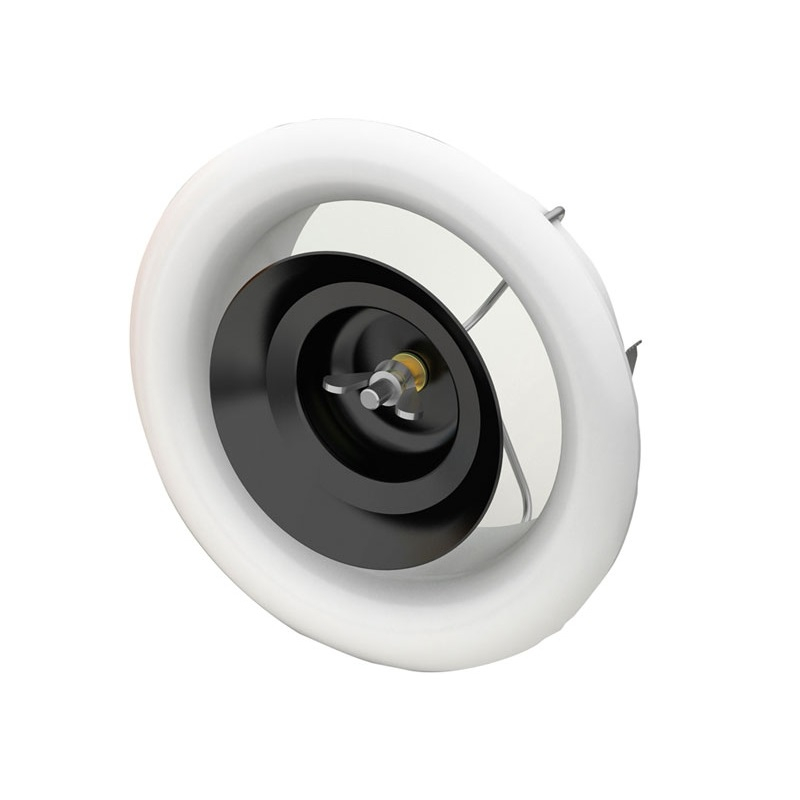 The valve is designed for installation at a wall or in a ceiling. It can be used for new-build and for replacement. Its smart grip function ensures an easy installation. Its unique sound data ensure an optimum sound level. The valve consists of two parts; the valve body (AIRYB) and the flat front plate (AIRYFP). The valve body is fixed to the duct system or a valve socket via flexible spring wings. The front plate is attached to the valve body via springs.