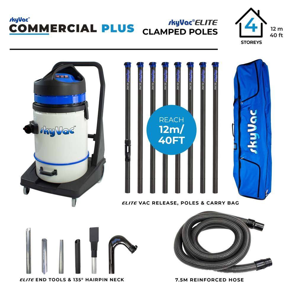 When using this innovative high reach cleaning system for your gutters, you have the added advantage of a unique user-friendly design with an advanced ultra-lightweight yet incredibly strong, high-tech carbon fibre pole making it effortless to work with. This kit contains; a commercial wet & dry vacuum, 8 x 1.5m carbon fibre poles with a 12m reach, 6m of Flexi pickup hose, crevice tool, steel dirt breaker, tapered end tool, daily end tool & long reach tool, 135° blue tool holder, 180° blue tool holder and pole and accessory carrying bag.