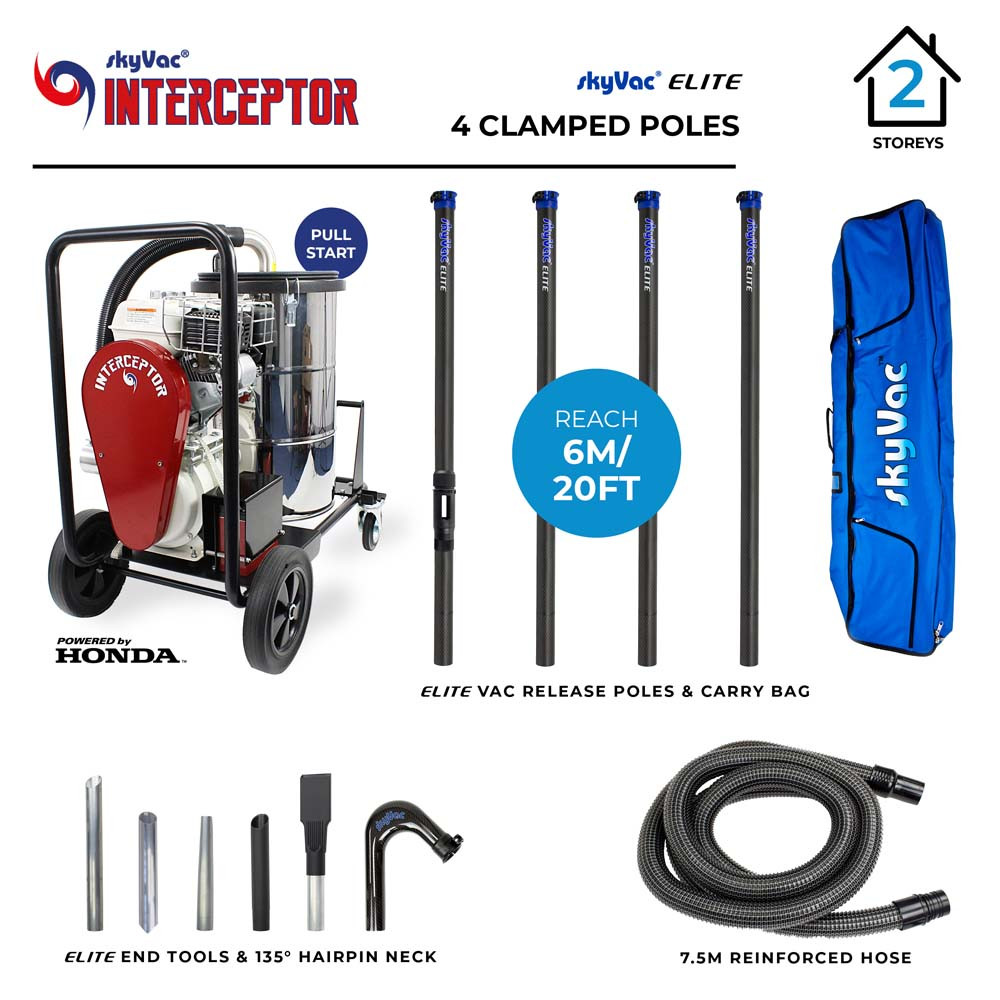 As standard, this kit provides the SkyVac interceptor, a SkyVac release pole (from the pole package), 5 versatile end tools that come in handy for many uses, and a 6m flexi hose that is 50mm in diameter. It also supplies a carbon fibre tool holder and a suction pole carry bag.
