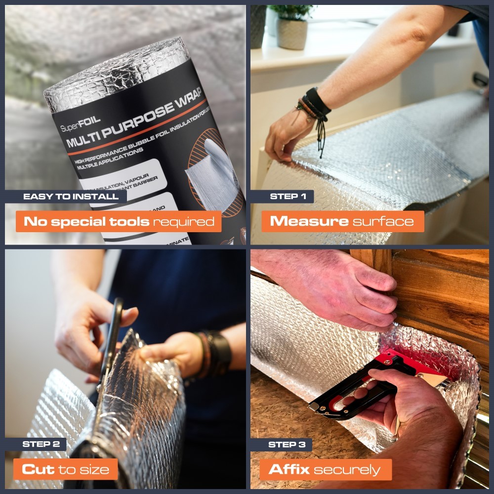 For roofs, walls, and floors and several other applications in applications in domestic, commercial and industrial builds, SuperFOIL General Purpose Wrap multifoil insulation is a versatile multi-layer DIY reflective insulation. It is ideal for enhancing your building's thermal performance and can be used in dry lining systems, as well as greenhouses and industrial buildings.