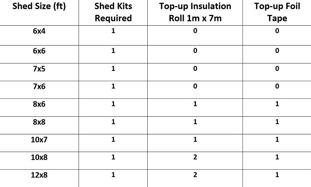 • Top-up rolls of SuperFOIL General Purpose insulation can be purchased for larger buildings- please see Shed Size Chart found in Fitting Instructions for details.