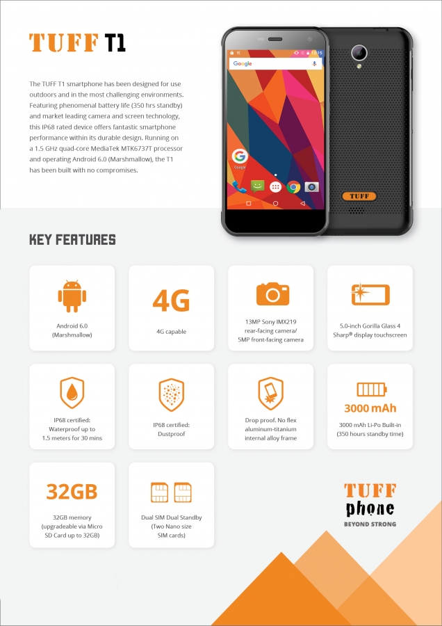 Running on Android 6.0 (Marshmallow) the TUFF T1 offers spectacular power management thanks to the inclusion of Android Doze. When your device is at rest, Doze automatically puts your T1 handset into a sleep state - meaning no more unnecessary battery drain from unused apps.