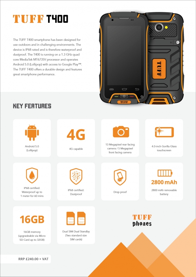 There is a 1.3GHz quad-core MediaTek MT6735 processor with 2GB RAM powering the TUFF T400, you'll also find a 2800 mAh battery that will enable you to keep going all day long without having to worry about your battery.