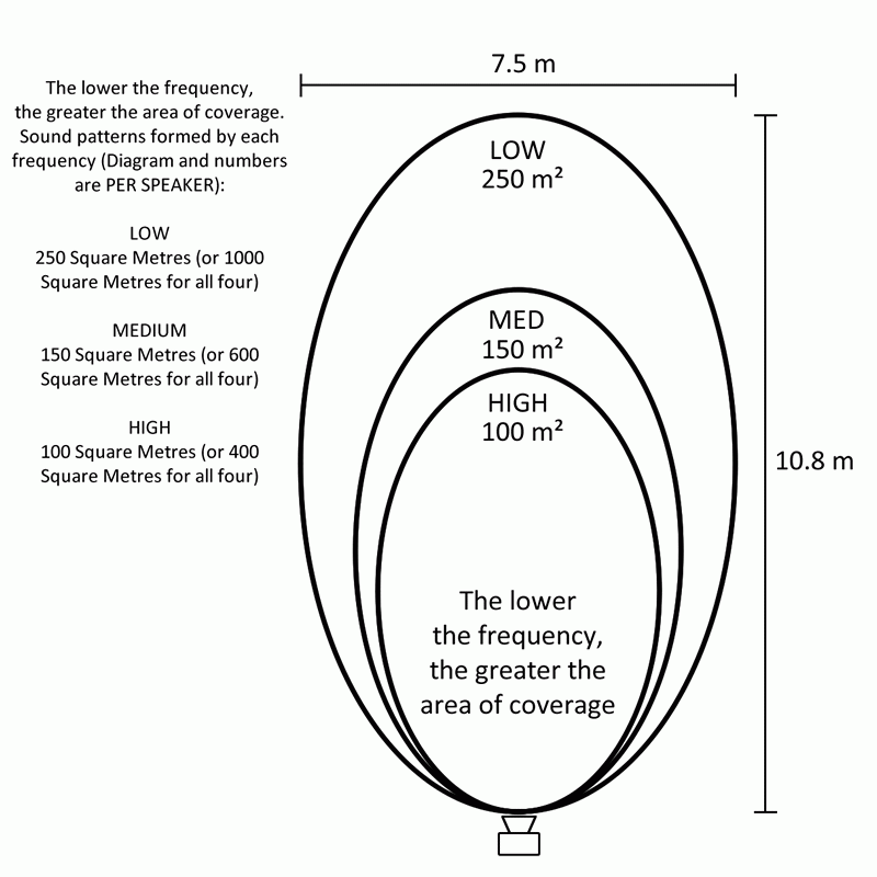 The UltrasonX covers up to 3600 square feet, 8-10 meters in front of each speaker in an oval dispersal pattern. The speakers must have line of site with pest birds to be effective. High frequency output does not travel around corners or through solid objects.