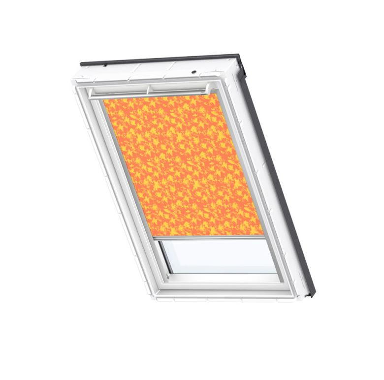 This VELUX blackout blind is available in VELUX’s vegetal pattern. The vegetal pattern is an autumnal style blackout blind, with orange and yellow colours running through a leaf patterned design. This vegetal pattern VELUX blackout blind is perfect when combined with relatively traditional and neutral colours, adding a touch of colour and style without being overbearing. Use this VELUX patterned blackout blind in living rooms, offices and bedrooms to create a simple yet attractive finish