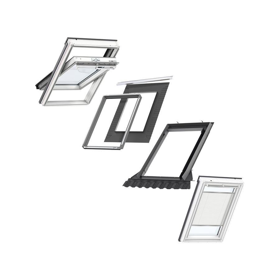 This VELUX pitched roof window bundle comprises everything needed for a sound and watertight install of an attractive and modern roof window on either a slate or tiled roof. In this bundle you will find a white painted centre-pivot window which is the one of the most popular type of roof windows. The window can be opened from 0 – 180 degrees allowing for total control alongside the pleated blind.
