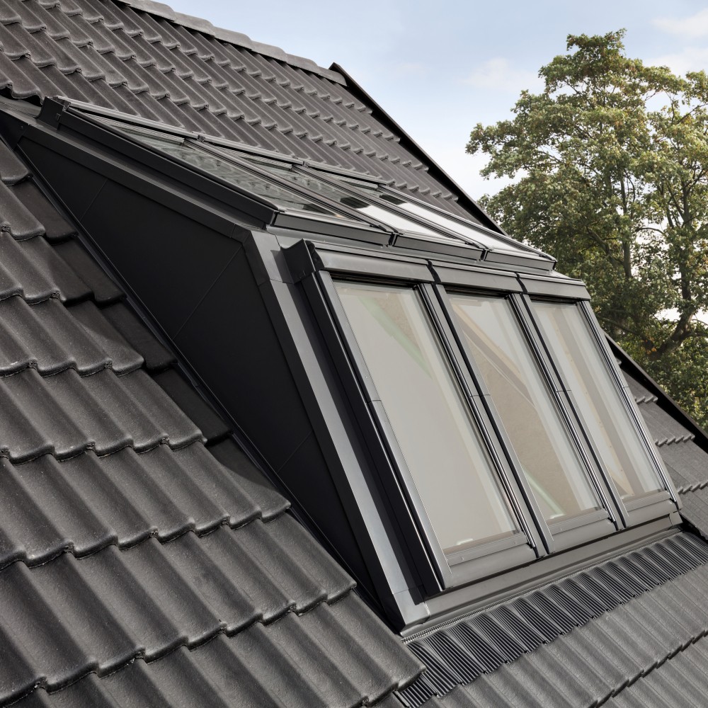 The VELUX 6 Window Dormer system includes 3 GPU 0070 top-hung roof windows and 3 GGU 0070 centre-pivot roof windows, all featuring a white durable, maintenance-free finish. The VELUX --70 glazing provides rain noise reduction, anti-dew safety lamination, toughened glass, and a UV filter for protection from harmful UV rays.