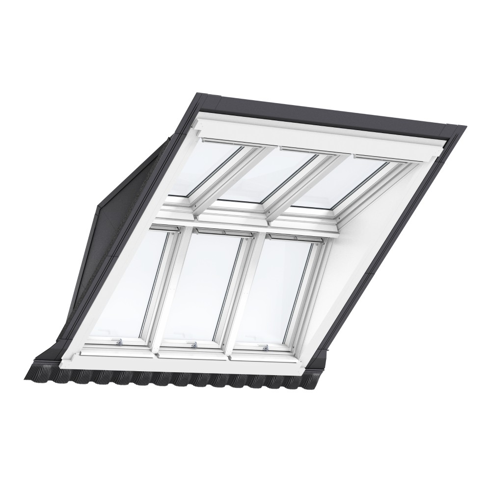 The VELUX GGU SB0W32101 White Maintenance-Free 6 Window Dormer System is a great alternative to a traditional dormer. This roof window system increases headroom and usable space while maximizing the amount of natural light in the room. It is suitable for roof pitches between 35 and 70 degrees.