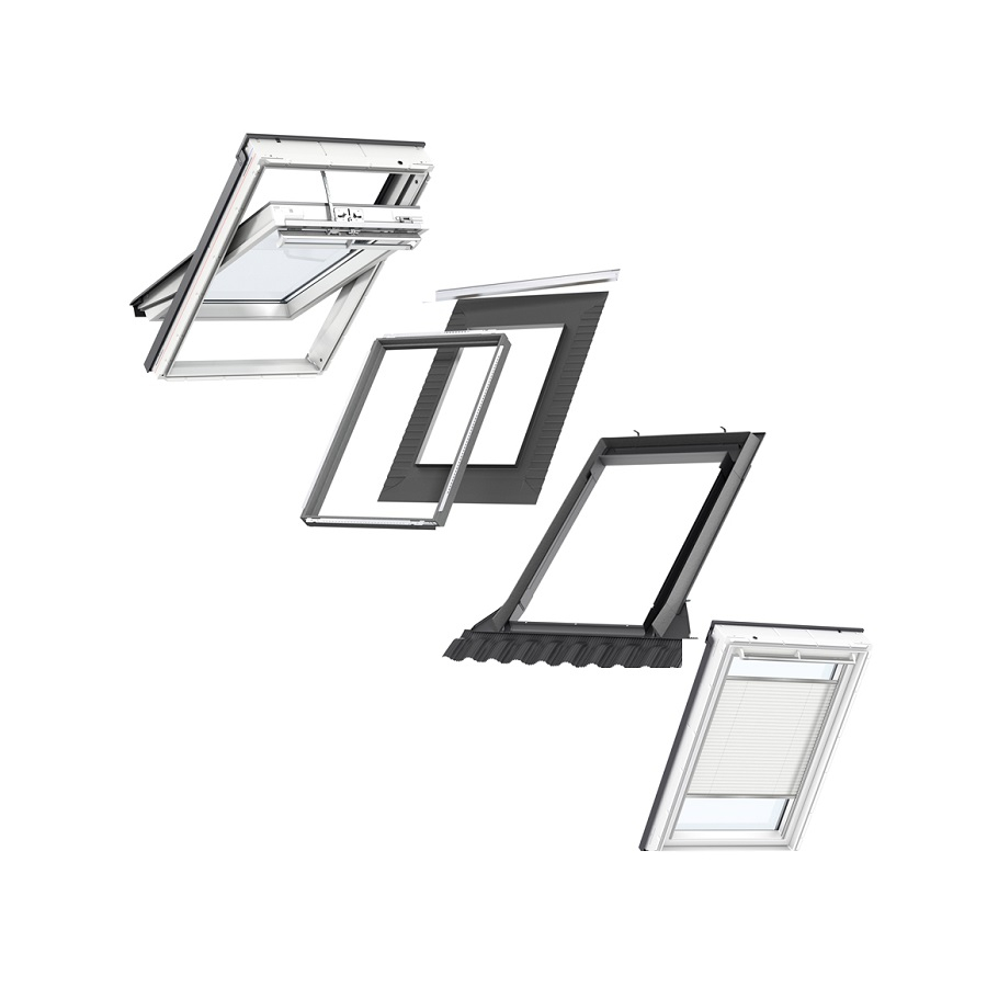 In this bundle is everything needed to fit a VELUX INTEGRA pitched roof window, including the flashings for either slate or tiled roofs and the installation products which are an insulation collar, an underfelt collar and a drainage gutter. All these accessories come alongside the window itself and an electric pleated blind.