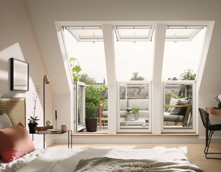 This VELUX roof terrace doesn’t come with the external balcony floor and the railings will need to be purchased separately. Suited for pitches of 35° to 53°, this roof terrace system features 2 top hung windows and a left hung vertical window. The left-hand top hung window opens to 45° and the left-hung vertical window open together to give you terrace access.