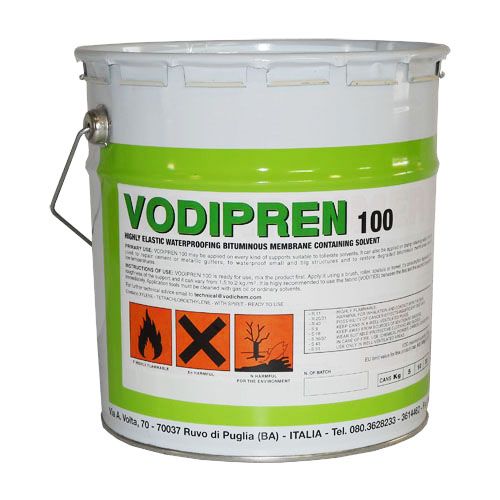Vodipren 100 Solvent Based Bituminous Liquid Membrane - 5kg Black Description Vodipren 100 is a highly elastic waterproofing solvent based bituminous liquid membrane that can be applied to wet surfaces and can be used all year round, even in the winter ! This product is a... Read More