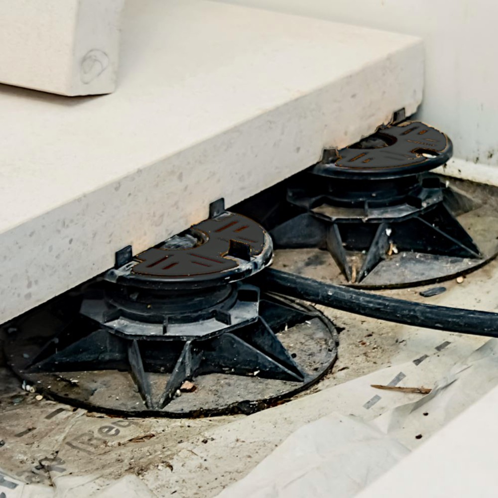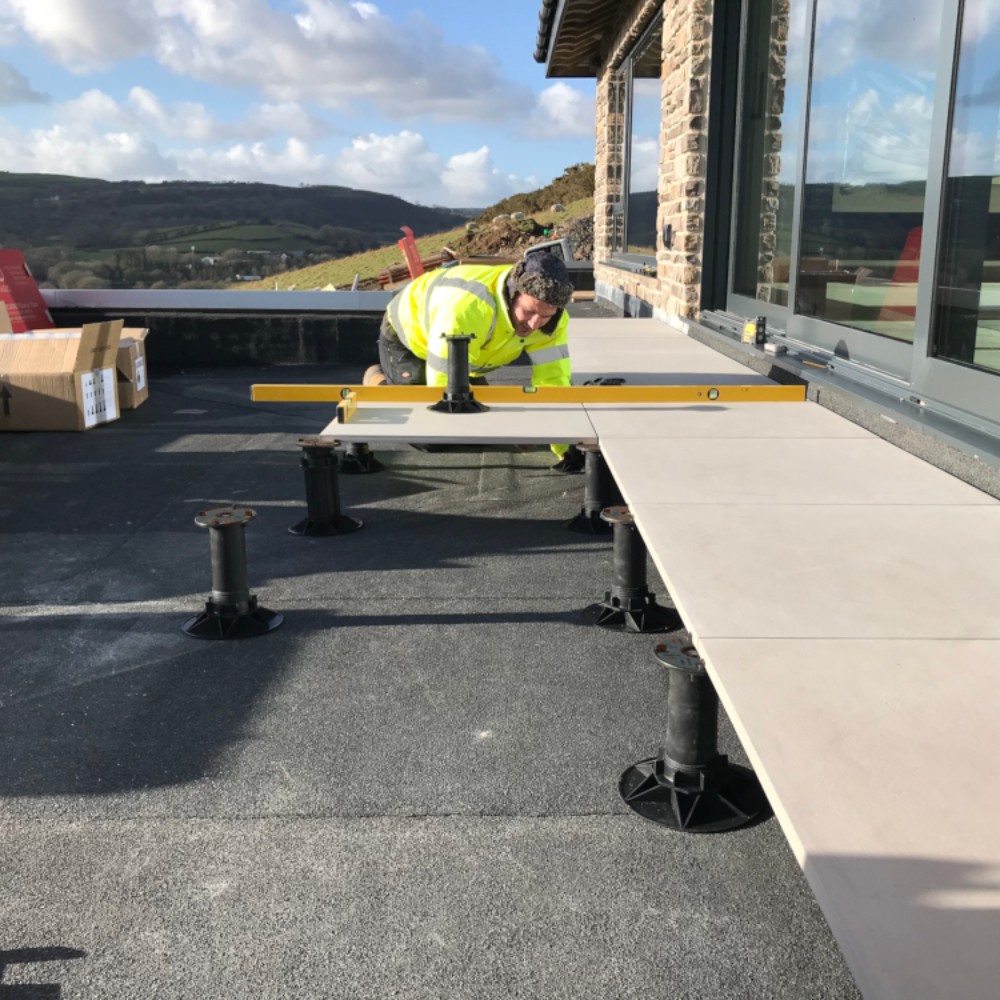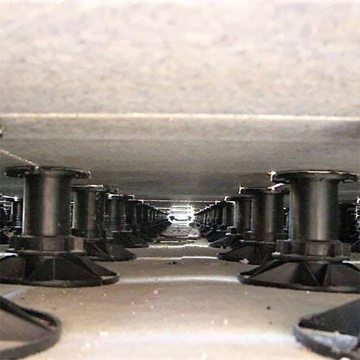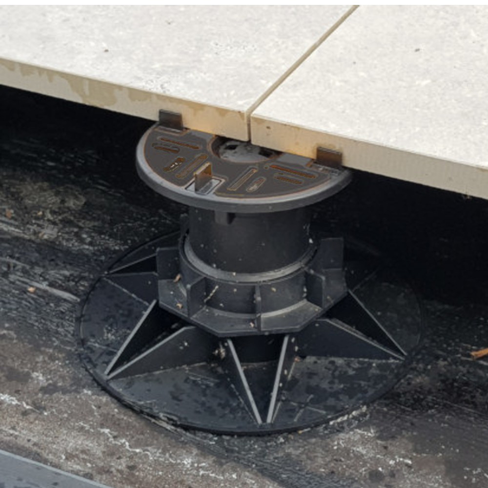 Universal Extra pedestals are a freestanding system, so no fixings are made through the membrane underneath, ideal for warm roofs and inverted waterproofing systems. They also come with an integrated acoustic shim on the headpiece. The pedestals create a cavity between the sub-deck and the paving/decking surface which helps ventilate the structure and allows services such as pipes and cables to be hidden from view.
